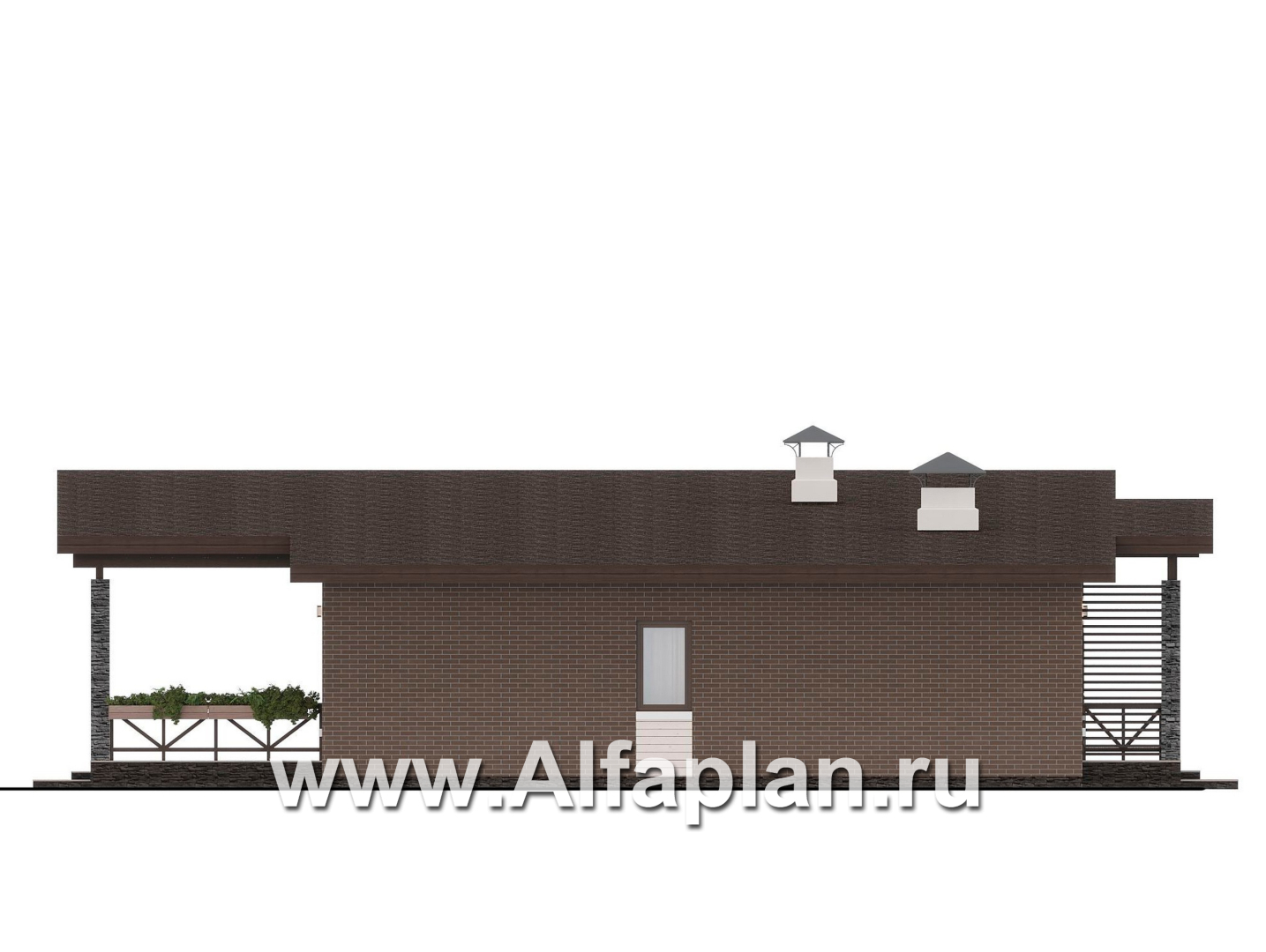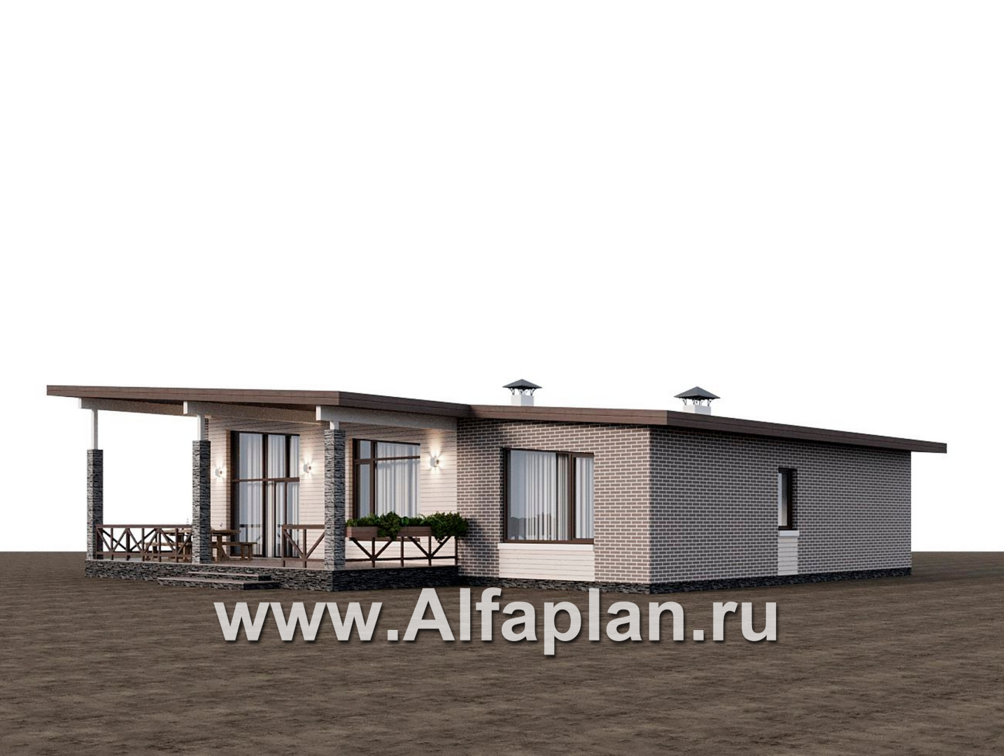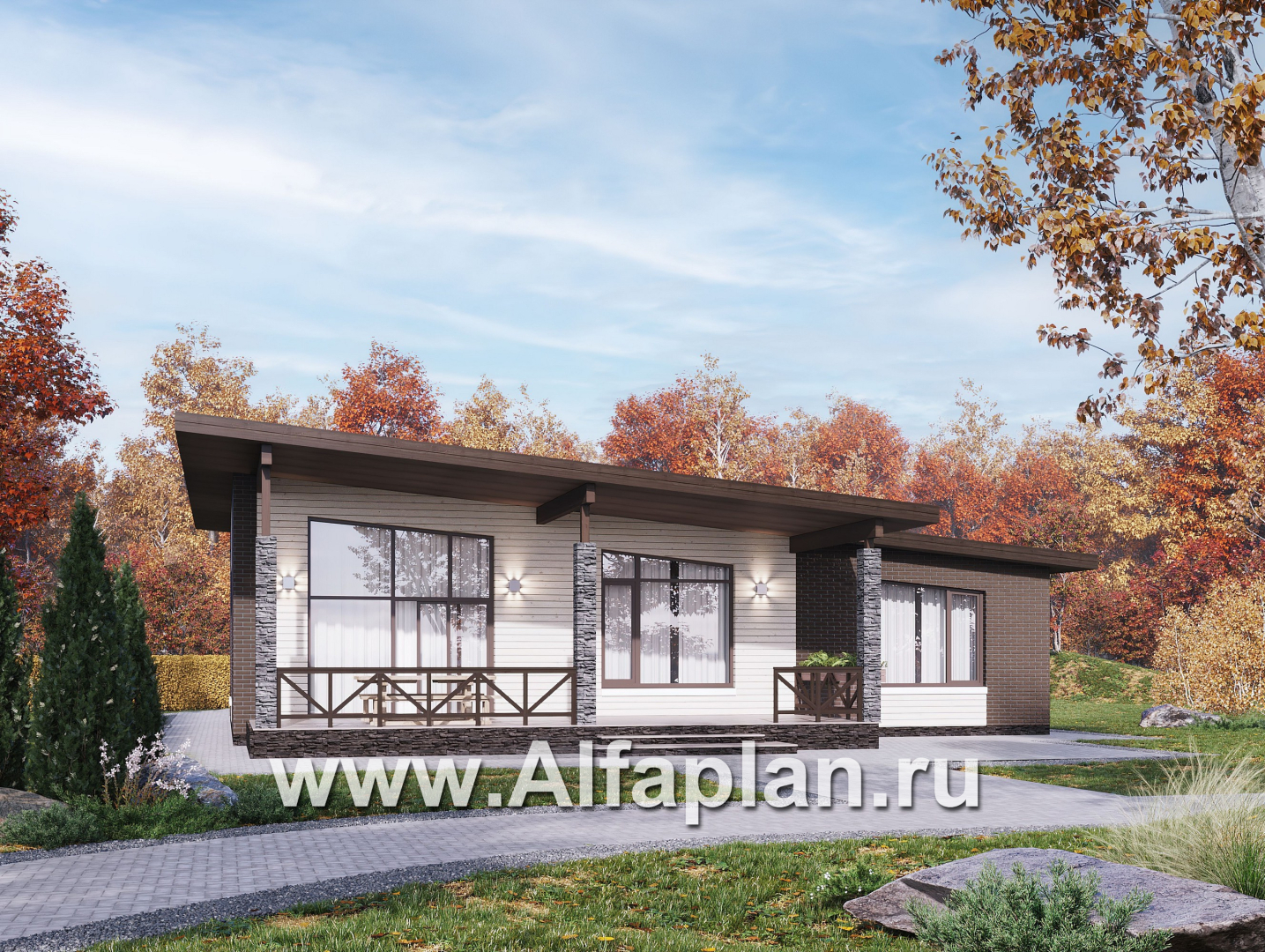«Стрелец» -проект современного одноэтажного дома с террасой со стороны входа, с односкатной крышей