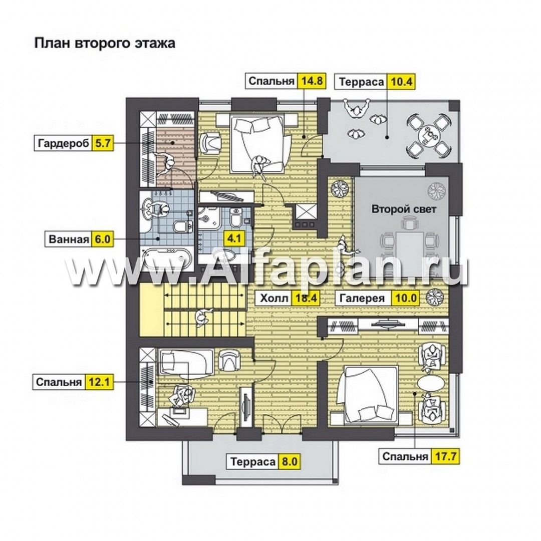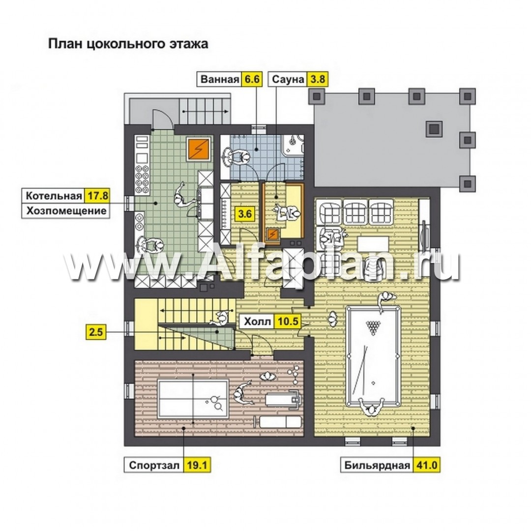 На втором этаже имеются три спальни, две из которых с выходом на открытые террасы. Все комнаты имеют большие окна, что обеспечит хорошую освещенность помещений. Спальня для родителей имеет выход в примыкающую гардеробную и ванную. В цокольном этаже расположены хозяйственные помещения, сауна, спортивный зал и бильярдная комната. После тяжелого трудового дня вы сможете расслабиться в тишине горячей сауны или устроить турнир по бильярду среди друзей. Жить в таком доме – мечта каждого!