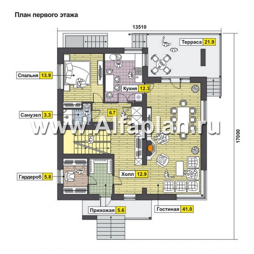 Двускатная крыша состоит из двух частей: малой, расположенной над главным входом с террасой, большой – покрывающей основную часть дома. Популярные проекты коттеджей из кирпича имеют два жилых этажа и функциональный цоколь. На первом этаже просторный холл совмещен с гостиной, где перед камином могут собираться большие компании друзей и родных. Спальня, удаленная от шумной гостевой комнаты, подойдет пожилым родителям, которым тяжело пользоваться лестницей.