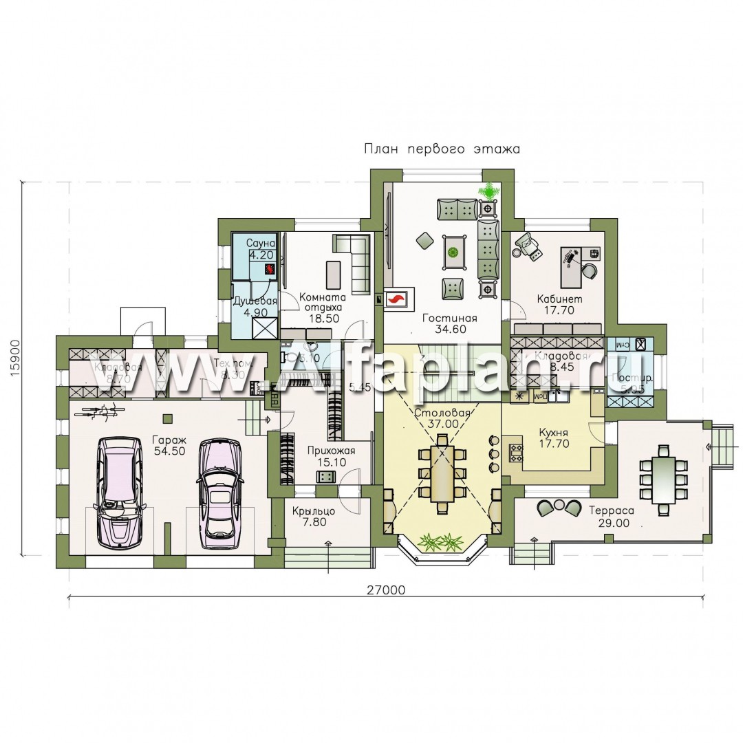 716B-S «Сена» —проект двухэтажного дома, особняк с эркером в двусветной столовой, с террасой и сауной
