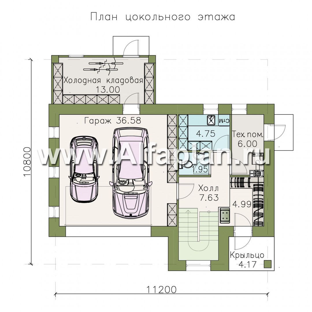 Кроме первого и второго этажа, коттедж имеет цокольный этаж, который вмещает в себе гараж больших размеров, способный разместить два автомобиля, холл, санузел и техническое помещение. Возле гаража находится холодная кладовая, благодаря которой, жилое помещение освобождается от громоздких вещей, улучшается среда, в дом попадает меньше пыли и грязного воздуха.
