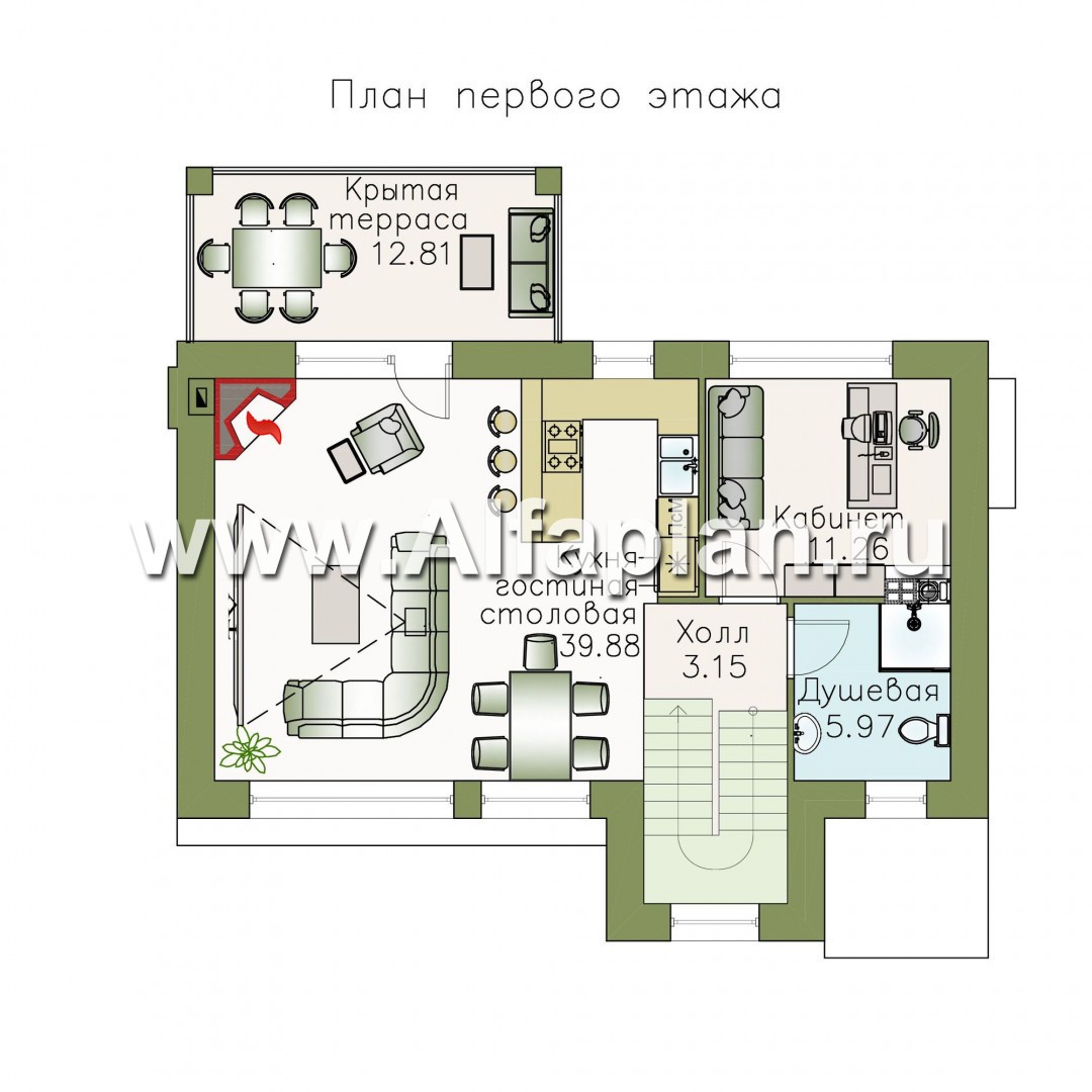 Первый этаж трехэтажного коттеджа предназначен для приема гостей или трудовой деятельности. Условно его можно поделить на две зоны: рабочая – имеет рабочий кабинет, и зона отдыха – кухня, столовая, гостиная, которые соединены в одну целую комнату. Кроме этого, гостиная имеет выход на крытую террасу. Теперь гости будут не только греться у большого камина (который тоже имеется), но и наслаждаться красивыми вечерними закатами.