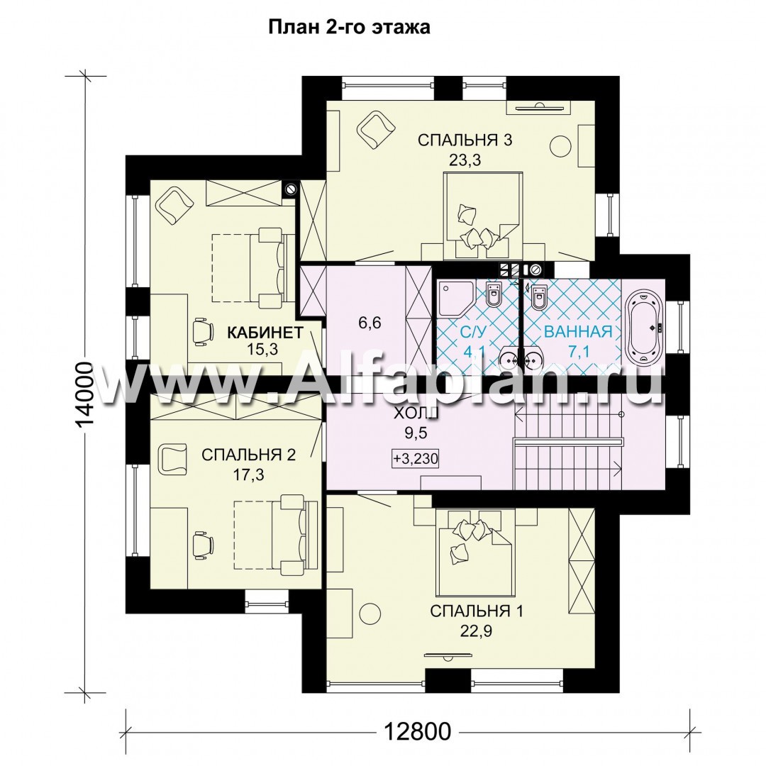 На 2 этаже по плану — три просторные спальни и кабинет хозяина. Все помещения прекрасно освещены естественным светом благодаря обилию высоких витражных окон. Широкая ванная комната с джакузи и санузел локализованы по центру строения, что делает пользование ими доступным для всех домочадцев.