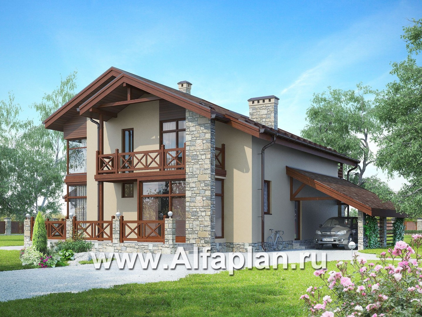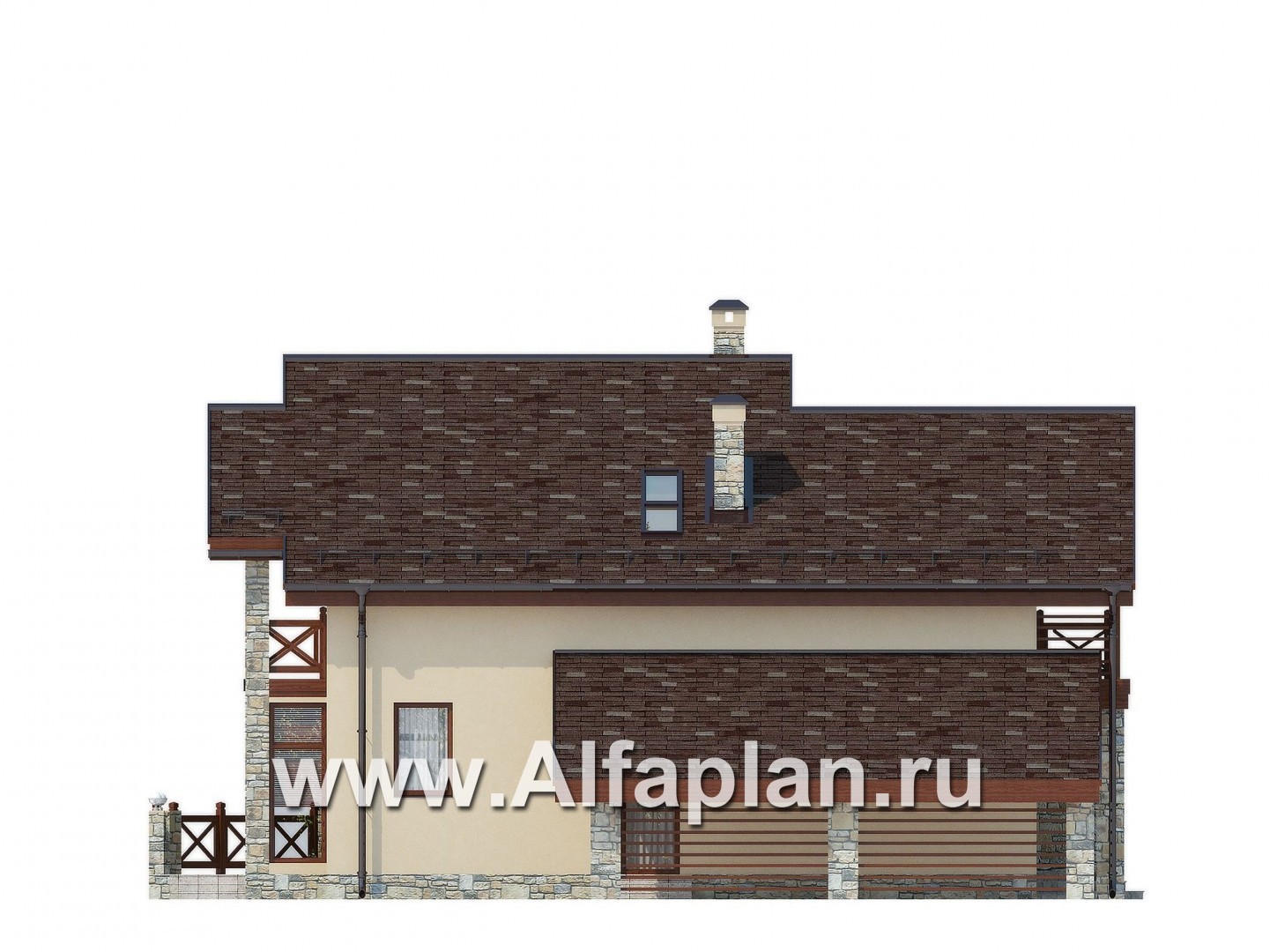 K-092 Проект дома с мансардой, планировка с кабинетом на 1 эт и навесом на 1 авто, с угловой террасой