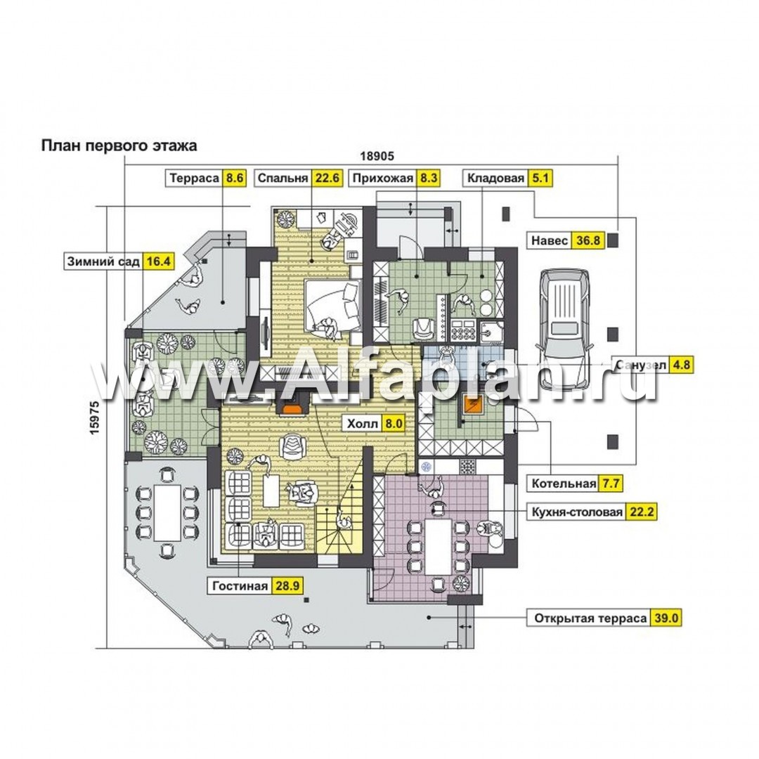 Проект дома с мансардой, планировка с кабинетом на 1 эт и навесом на 1 авто, с угловой террасой